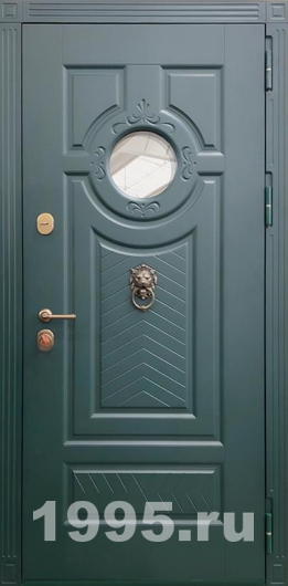 Стальная дверь с круглым стеклом, кнокером и зелеными панелями МДФ RAL (терморазрыв)